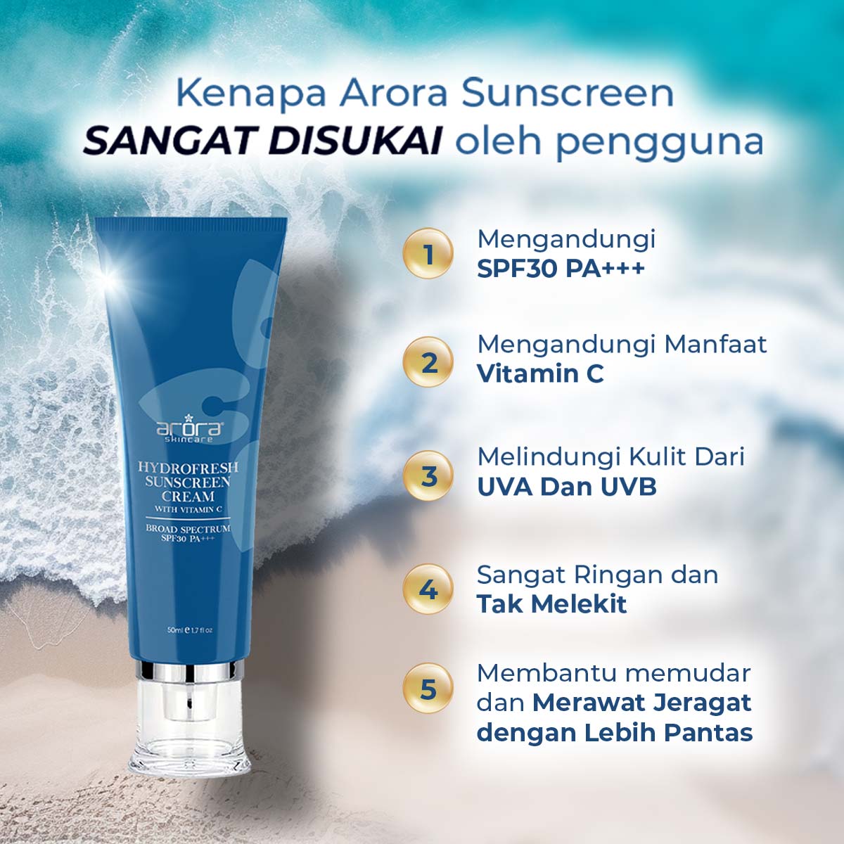 Arora Sunscreen pilihan Sunscreen yang paling sempurna kerana dilengkapi denganSpf30 PA+++ dan Vitamin C