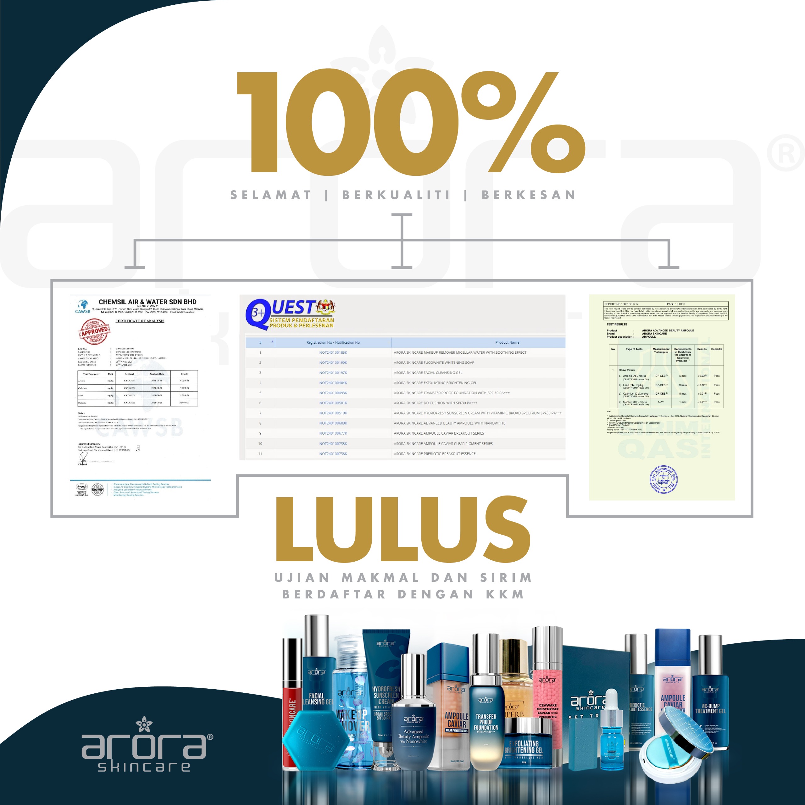 Bukan semua skincare diuji di makmal atau disahkan KKM. Tapi Arora Skincare lain, Kami buat ujian makmal, diperakui SIRIM dan ada nombor NOT KKM, sebab kami nak pastikan setiap pengguna rasa selamat, yakin & puas hati