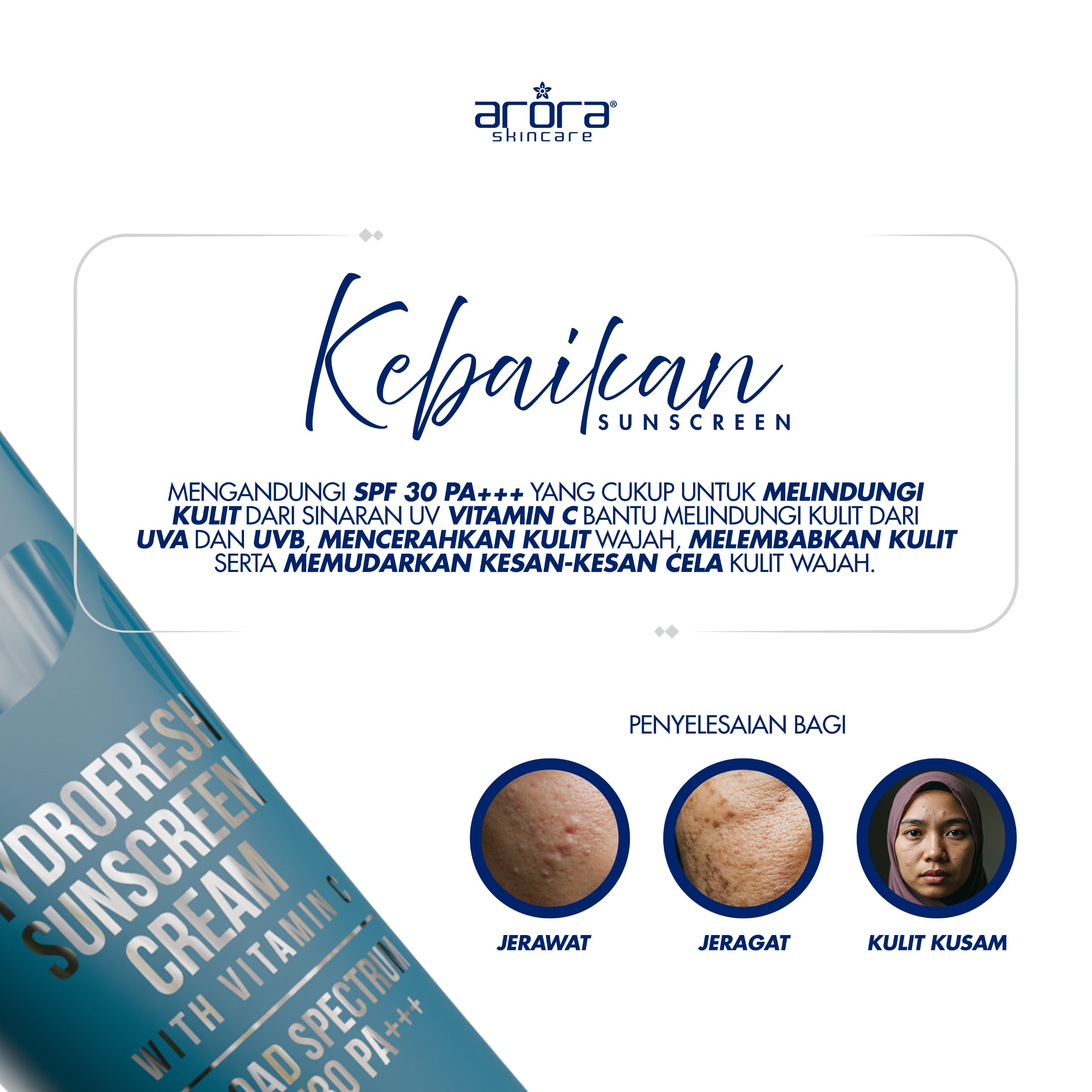 Anda dah dapat set yang ada tambahan Sunscreen Arora Skincare. Sunscreen Arora kaya dengan vitamin C dan sangat ringan pada wajah.